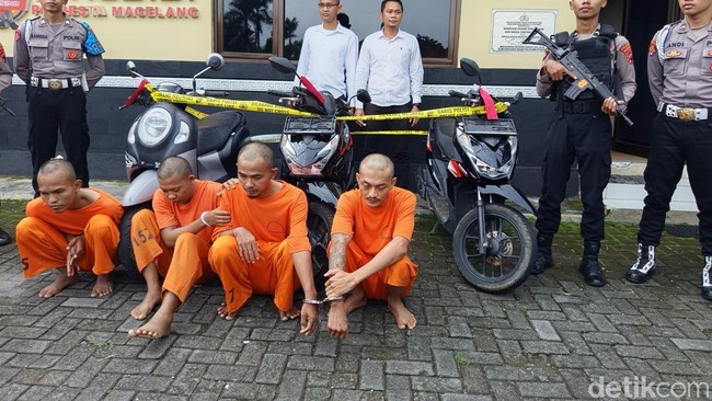 Petugas gabungan Polres Magelang Kota dan Polresta Magelang memamerkan 9 pelaku maling motor jaringan Lampung dan Indramayu yang berhasil ditangkap. Dari 9 pelaku, 2 di antaranya ditembak kakinya. Sedangkan, bos para pelaku masih buron.