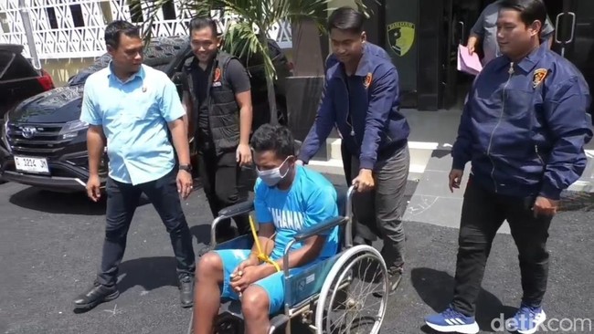SR tampak pincang saat dihadirkan dalam jumpa pers di Mapolres Pemalang, hari ini. SR tampak mengenakan kaus tahanan berwarna biru dan menggunakan kursi roda.