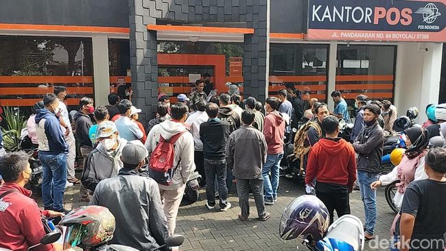 Antrean warga yang hendak membayar tilang tampak mengular di Kantor Pos Boyolali hari ini. Antrean bahkan membeludak hingga ke halaman Kantor Pos di Jalan Pandanaran, Boyolali itu.