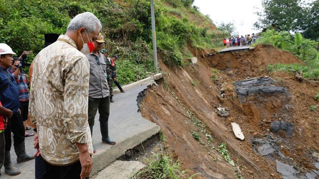 Gubernur Jawa Tengah Ganjar Pranowo meninjau langsung jalan putus di Desa Samudera Kulon, Kecamatan Paguyangan, hari ini. Putusnya jalan tersebut disebabkan karena longsor yang terjadi beberapa waktu lalu di Kecamatan Gumelar dan Kecamatan Paguyangan.
