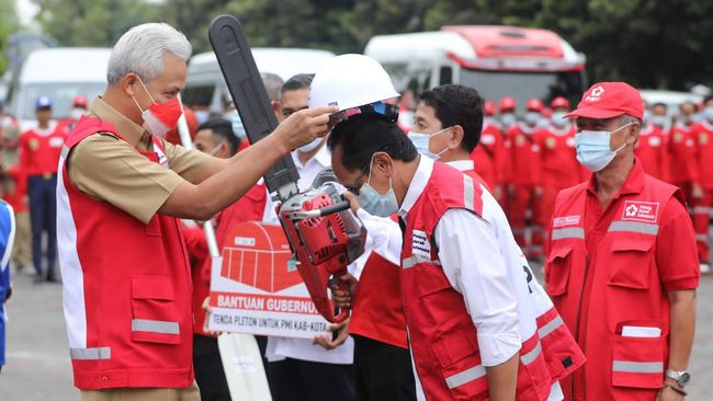 Gubernur Jawa Tengah (Jateng) Ganjar Pranowo menyerahkan bantuan perahu hingga alat pelindung diri (APD) kepada pasukan relawan Palang Merah Indonesia (PMI) Jateng. Bantuan tersebut dalam rangka mendukung upaya penanggulangan bencana di Jateng.