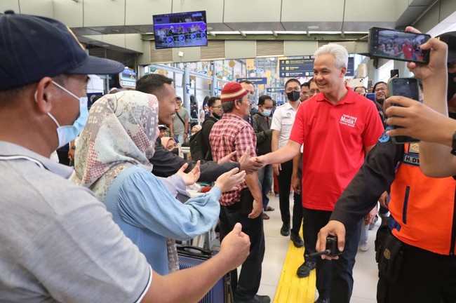 Dalam kesempatan tersebut, Ganjar tampak blusukan di tengah keramaian pemudik yang hendak pulang ke kampung halaman menggunakan kereta api. Mengenakan baju merah bertuliskan 'Cuma Mau Mudik Nyambi Piknik', Ganjar menyempatkan diri untuk menyapa para pemudik dan keluarganya.