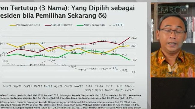 Lembaga survei Saiful Mujani Research & Consulting kembali merilis hasil survei terkait dengan elektabilitas tiga tokoh yang potensial menjadi calon presiden pada Pilpres 2024. Hasilnya, elektabilitas Ganjar Pranowo jauh mengungguli Prabowo Subianto dan Anies Baswedan dalam simulasi tiga nama tertutup.