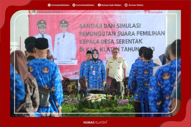 Kepala Dispermasdes Kabupaten Klaten, Wahyuni Sri Rahayu menyampaikan santiaji dan simulasi pemungutan suara Pilkades serentak gelombang I tahun 2023 diselenggarakan dalam rangka memberikan petunjuk, pengarahan mengenai strategi pelaksanaan Pilkades serentak gelombang I tahun 2023. Tujuan agar mewujudkan pengisian kepada desa di Kabupaten Klaten yang aman, tertib, demokratis, transparan.