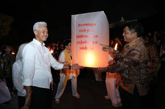 Sebanyak 2.567 lampion diterbangkan dalam acara itu. Setelah menerbangkan lampion, Ganjar mengaku merasakan getaran kebahagiaan dari sekitar ribuan umat Buddha yang bisa beribadah dengan hikmat di Candi Borobudur.