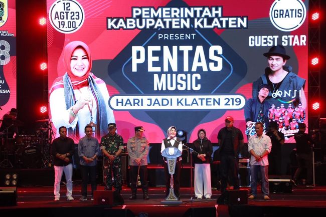 Musisi Anji hingga Budi Cilok memeriahkan konser musik peringatan Hari Jadi Kabupaten Klaten ke-219 dan Hari Ulang Tahun ke-78 Republik Indonesia, Sabtu (12/8). Konser musik yang digelar Pemerintah Kabupaten (Pemkab) Klaten itu berlangsung di Alun-alun Kabupaten Klaten.