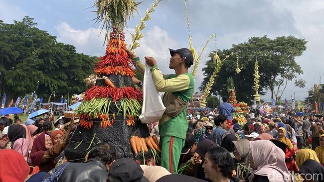 Ke-15 gunungan ini berisikan aneka hasil bumi, seperti kacang panjang, kentang, labu, padi hingga carica. Tak hanya laki-laki, emak-emak pun ikut berdesakan merebutkan hasil bumi ini.