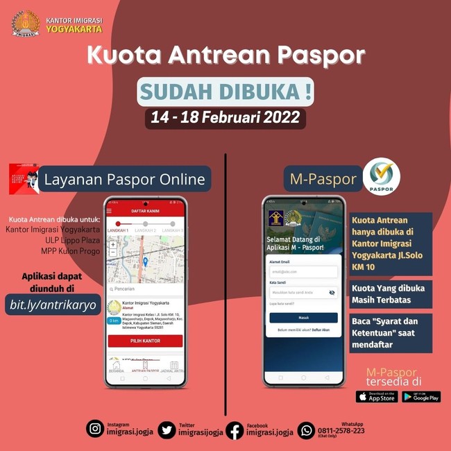 Sementara itu, jika melalui aplikasi M-Paspor, kuota antrean hanya dibuka di Kantor Imigrasi Yogyakarta, Jalan Solo Km 10. Kuota yang dibuka masih terbatas, dan masyarakat diminta membaca 'Syarat dan Ketentuan' saat mendaftar.