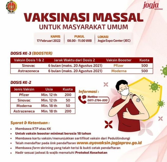 Mengutip akun Instagram Humas Pemda DIY @humasjogja, Senin (14/2/2022), vaksinasi dosis ke-2 dan ke-3 (booster) akan digelar di Jogja Expo Center (JEC) pada Kamis, 17 Februari 2022 pukul 08.00-11.00 WIB.