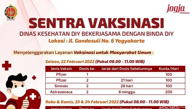 Pengumuman vaksin COVID-19 ini disampaikan lewat akun Twitter resmi Pemda DIY, Selasa (22/2/2022). Dalam cuitan itu disertakan poster berisi jadwal vaksin COVID-19. Lokasi vaksin COVID-19 ini digelar di Jl Gondosuli No 6 Yogyakarta.