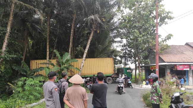 "Kesasar Selasa (8/3) siang, sekitar 13.30 WIB. Bahwa pada jam 24.00 WIB truk tronton dapat dikeluarkan ke arah barat dengan cara atret (mundur) ke belakang sampai ke arah lapangan Gentan, Margoagung, Seyegan," kata Kapolsek Seyegan AKP Darmana kepada wartawan, Rabu (9/3/2022).