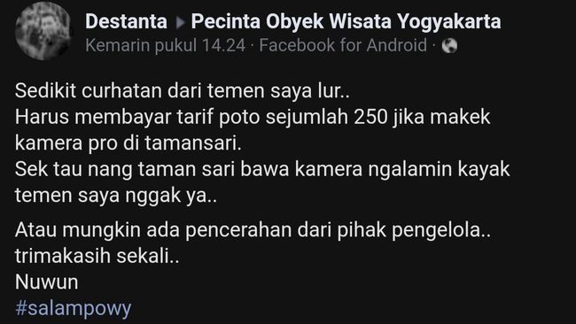 Curhatan pengunjung Tamansari Keraton Yogyakarta viral di media sosial. Pengunjung tersebut mempertanyakan biaya sebesar Rp 250 ribu karena membawa kamera profesional ke objek wisata itu.