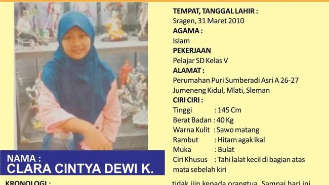 Bagi pembaca yang mengetahui keberadaan Clara bisa menghubungi Polsek Mlati atau call center kepolisian di nomor 110.