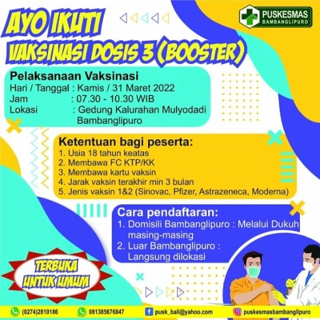 "Ini tidak cuma untuk warga Bambanglipuro tapi untuk semua (masyarakat) bisa. Untuk kuotanya ada banyak sekitar 1.500 (dosis)," kata Glory kepada detikJateng, Kamis (31/3/2022).
