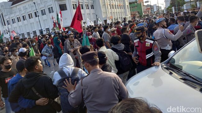 Massa aksi demonstrasi di Titik Nol Kilometer Jogja terlibat saling dorong dengan kepolisian. Massa memaksa untuk menutup jalan di sisi sebelah utara Titik Nol Kilometer.