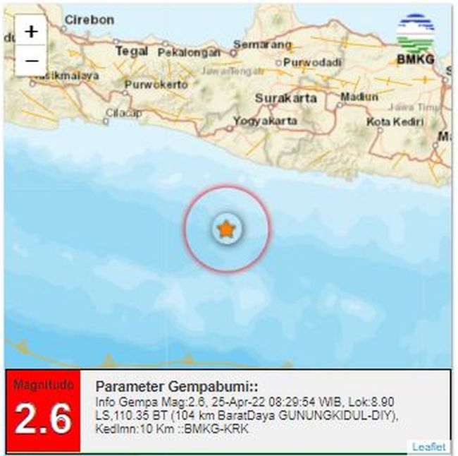 Gempa bumi dengan kekuatan magnitudo 2,6 terjadi di Kabupaten Gunungkidul, Daerah Istimewa Yogyakarta, Senin (25/4/2022) pagi. Pusat gempa berada di laut.