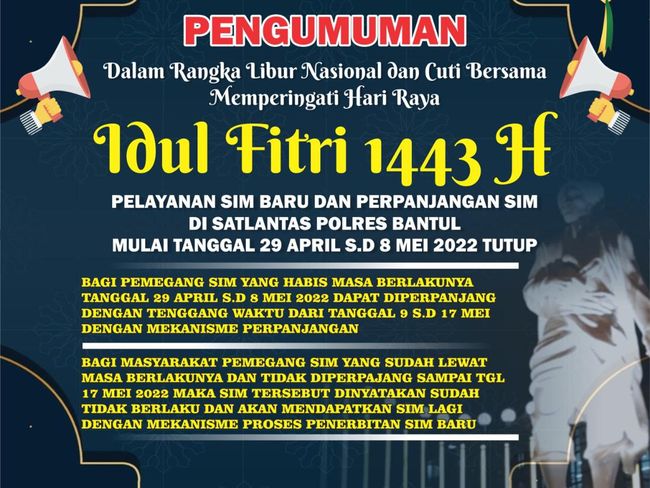 "Dalam rangka libur nasional dan cuti Hari Raya Idul Fitri 1443 H pelayanan SIM baru dan perpanjangan SIM di Satlantas Polres Bantul mulai tanggal 29 April sampai dengan 8 Mei tutup," kata Kasat Lantas Polres Bantul AKP Gunawan Setiyabudi kepada detikJateng, Rabu (27/4/2022).