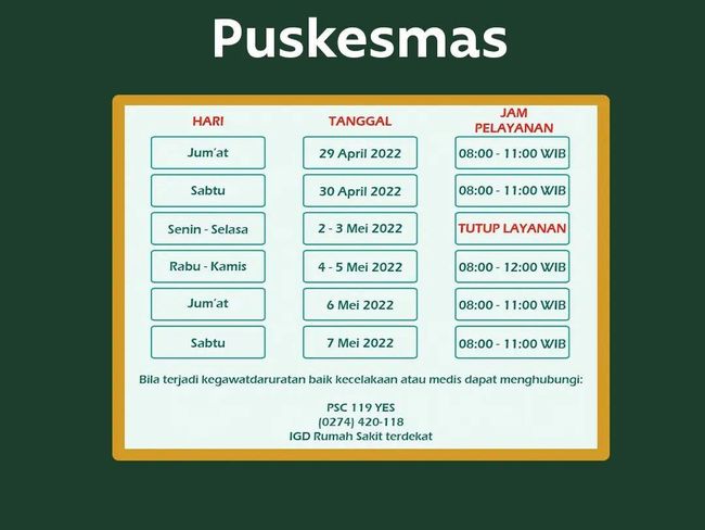 Mengutip akun Twitter Pemkot Jogja, jadwal operasional ini disampaikan dengan infografis. Khusus pada periode 2-3 Mei mendatang layanan di puskesmas ditutup.
