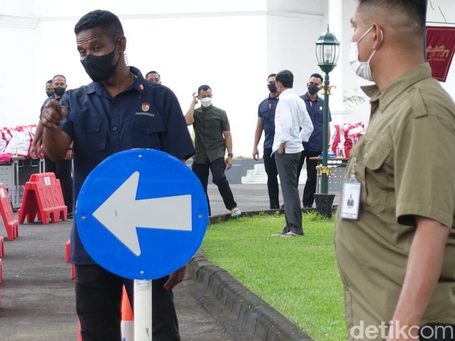 Jokowi berdiri di sisi utara lokasi pengambilan sembako tampak menyapa warga yang sudah menerima bantuan. Selain menyapa warga, Jokowi juga memberikan amplop ke sejumlah lansia yang ikut antre.