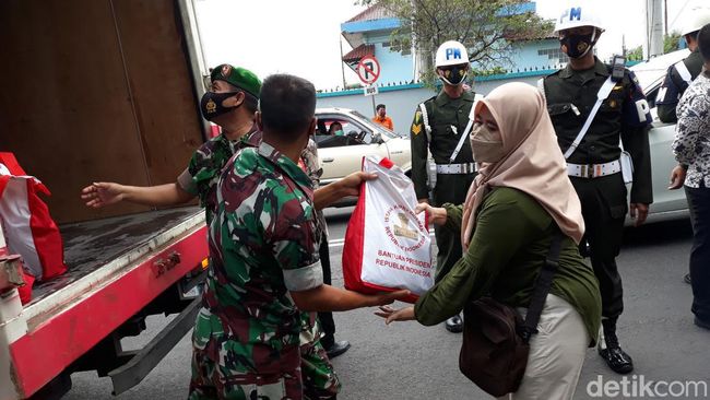 Pantauan detikJateng pada pukul 15.24 WIB tampak warga mengantre di sisi barat Pasar Serangan. Mereka berjalan ke arah timur untuk mendapatkan sembako yang dibagi petugas.