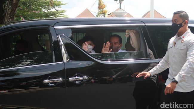 Pantauan detikJateng, Jokowi keluar dari Gedung Agung pukul 12.49 WIB menggunakan mobil Alphard hitam pelat H.