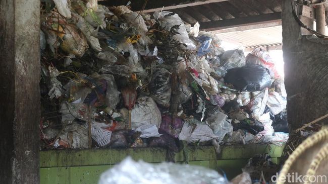 Pantauan detikJateng, Selasa (10/5), di depo pembuangan sampah Pasar Bantul siang ini tampak tumpukan sampah menggunung. Tampak gerobak berisi sampah terparkir di dekat depo.