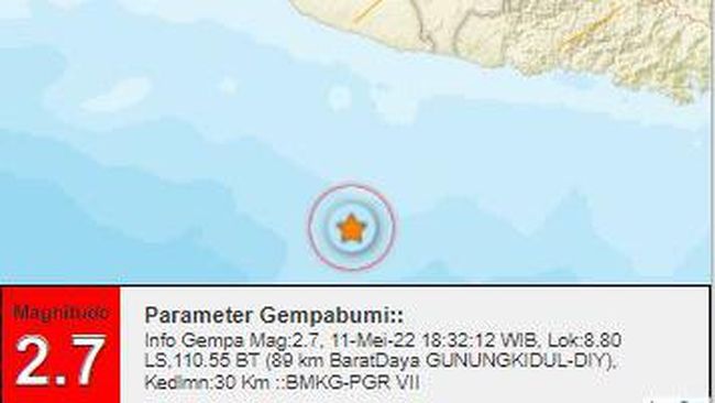 Gempa berkekuatan magnitudo 2,7 terjadi di Gunungkidul, Daerah Istimewa Yogyakarta (DIY). Gempa ini berpusat di laut.