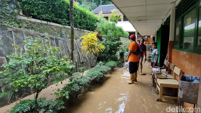 "Jadi saluran air itu jebol kemudian material longsor keluar dari halaman lalu menggenangi dua ruangan yakni ruang kelas dan perpustakaan," ucap Sudamar saat ditemui di lokasi, Kamis (26/5/2022) sore.