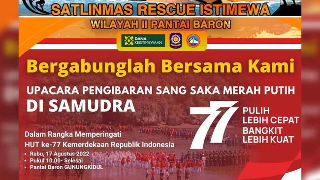Tim SAR Satlinmas Wilayah II Kabupaten Gunungkidul bakal menggelar upacara pengibaran bendera HUT ke-77 RI di tengah perairan kawasan Pantai Baron. Tim SAR memperbolehkan masyarakat ikut dengan catatan bisa berenang dan membawa pelampung sendiri.