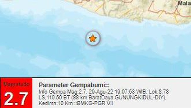 "Info Gempa Mag:2.7, 29-Agu-22," demikian dikutip dari akun Twitter BMKG Daerah Istimewa Yogyakarta (DIY) @bmkgjogja, Senin (29/8/2022).