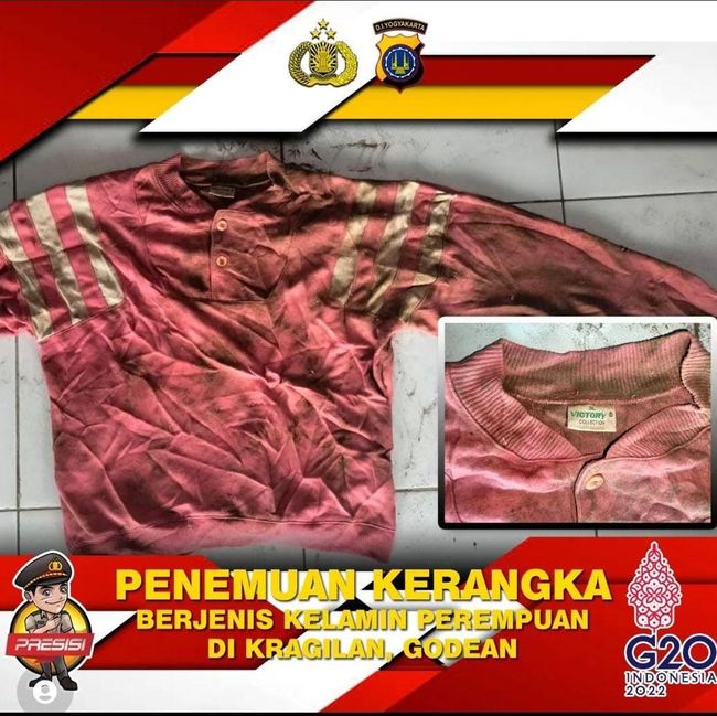Petunjuk itu diunggah akun resmi Instagram Polda DIY @poldajogja. Dilihat detikJateng, Minggu (11/9/2022) pukul 14.30 WIB, polisi mengunggah tiga foto berisi pakaian yang ditemukan pada kerangka manusia jongkok tersebut.
