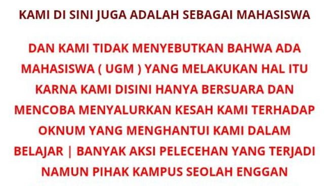 DAN KAMI TIDAK MENYEBUTKAN BAHWA ADA MAHASISWA (UGM) YANG MELAKUKAN HAL ITU KARNA KAMI DISINI HANYA BERSUARA DAN MENCOBA MENYALURKAN KESAH KAMI TERHADAP OKNUM YANG MENGHANTUI KAMI DALAM BELAJAR l BANYAK AKSI PELECEHAN YANG TERJADI NAMUN PIHAK KAMPUS SEOLAH ENGGAN MENUNTASKAN PERMASALAHAN ITU DENGAN ALASAN NAMA BAIK KAMPUS!