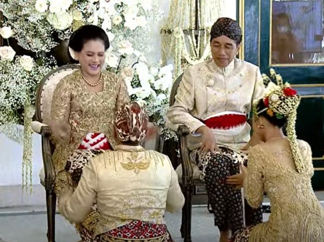 Jokowi dan Iriana sama-sama melempar senyum saat kedua mempelai melakukan sungkem. Kedua mempelai pun membalas dengan senyuman pula.