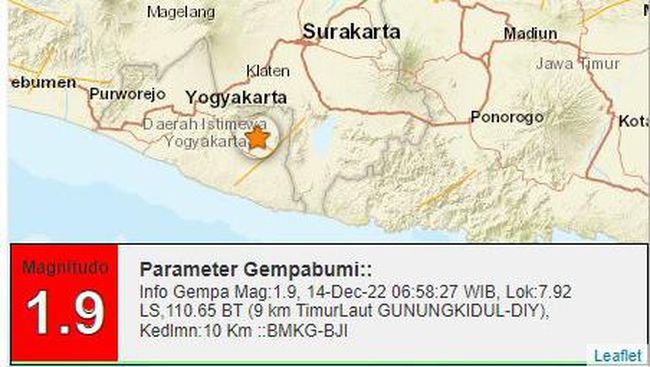 "Info Gempa Mag:1.9 SR, 14-Dec-22 06:58:27 WIB," demikian dikutip dari akun resmi Twitter BMKG DIY @bmkgjogja, Rabu (14/12/2022).
