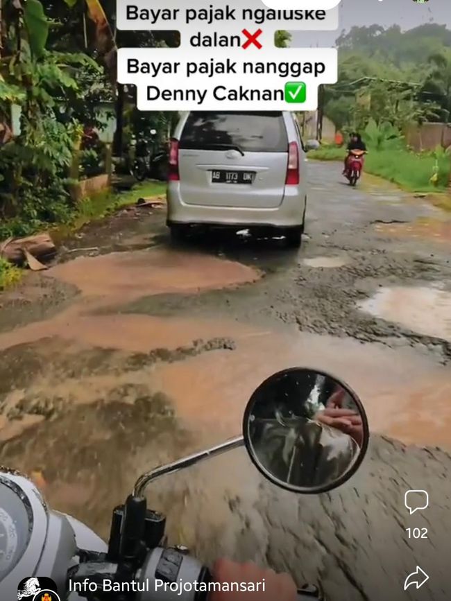 Dilihat detikJateng, Selasa (13/12), postingan di akun grup Facebook Info Bantul Projotamansari. Postingan video bernarasi kondisi jalan rusak di Bantul. Dalam video tersebut terdapat tulisan 'bayar pajak ngaluske dalan X' dan di bawahnya 'bayar pajak nanggap Denny Caknan ✓'.