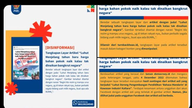 Beredar sebuah tangkapan layar dari artikel dengan judul "Luhut Menjelang tahun baru harga bahan pokok naik kalau tak dinaikan bangkrut negara" tulis Diskominfo DIY seperti dilihat detikJateng, Rabu (21/12/2022).