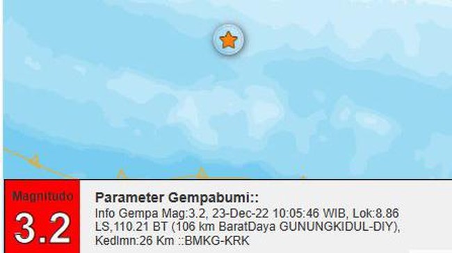 "Info Gempa Mag:3.2, 23-Dec-22," demikian dikutip dari akun resmi Twitter BMKG DIY @bmkgjogja, Jumat (23/12/2022).