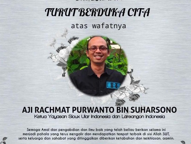 "Telah berpulang kerohmatullah kakak kami, saudara kami, pendiri Sioux yayasan ular indonesia, founder lareangon indonesia