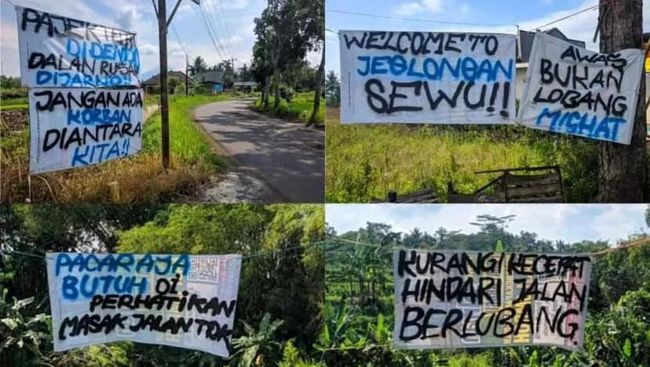 "Terkait Jalan berlubang di Jalan raya Banyurejo Tempel Sleman warga bersuara melalui spanduk diantaranya: