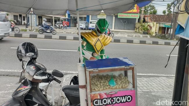 Penjual cilok di Sleman ini unik. Pria bernama Juwanso (40) itu berjualan memakai kostum super hero Power Rangers.