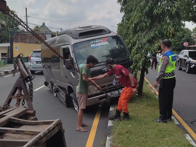 "Pecah ban depan sebelah kanan, kemudian melewati pembatas jalan hingga melawan arah. Minibus itu berhenti setelah terbentur pohon," ujar Catur.