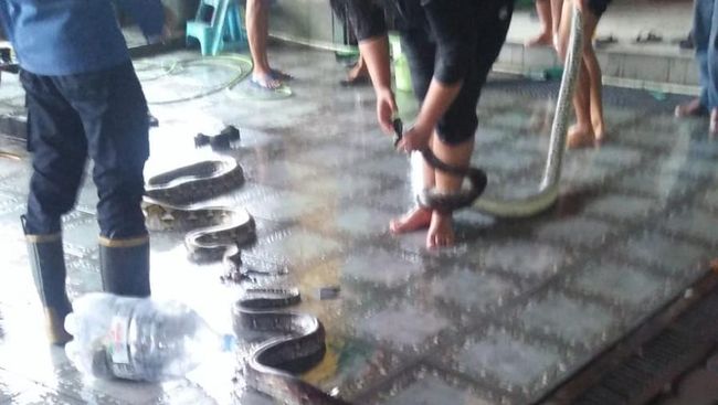 Melihat banyaknya ular sanca, salah satu karyawan lalu berinisiatif menangkap ular agar tidak masuk ke dalam restoran. Namun, upayanya tidak membuahkan hasil.