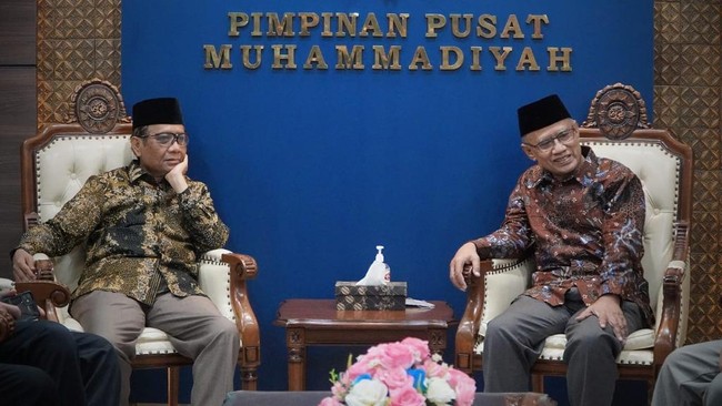 Mahfud Md menemui Ketua Umum (Ketum) PP Muhammadiyah Haedar Nashir. Pertemuan Menteri Koordinator Bidang Politik, Hukum, dan Keamanan (Menkopolhukam) dengan Haedar itu berlangsung di kantor Pimpinan Pusat (PP) Muhammadiyah, Kota Jogja.