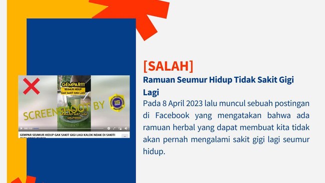 Postingan tentang ramuan herbal yang diklaim bisa menangkal sakit gigi seumur hidup ramai beredar di Facebook. Dinas Kominfo DIY memastikan postingan tersebut tidak benar alias hoax.