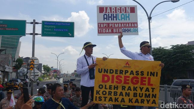 Massa yang menamakan diri Persatuan Korban Istaka Karya (Perkobik) menggelar aksi di Underpass Kentungan, Ring Road Utara, Depok, Kabupaten Sleman. Mereka menuntut pembayaran dari PT Istaka Karya.