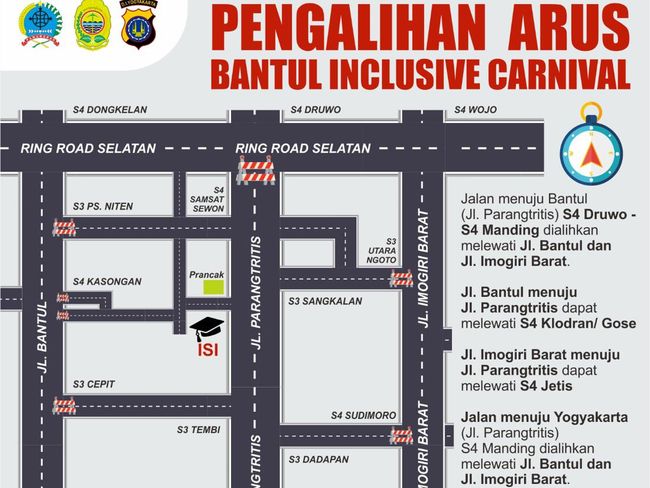 Polisi akan memberlakukan rekayasa lalu lintas di Jalan Parangtritis, tepatnya di sekitar Institut Seni Indonesia (ISI) Yogyakarta hingga Pasar Seni Gabusan, Sewon, Bantul. Hal itu lantaran adanya Bantul Inclusive Carnival (BIC) yang berlangsung besok siang hingga sore.