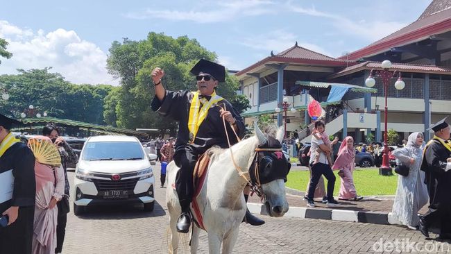 "Jadi saya naik kuda yang perkasa dan ini lebih klasik lebih vintage kuda itu dan warnanya putih. Kenapa? Karena lulusan UGM itu harus berjiwa putih berjiwa suci dan harus mempunyai diawali dengan perjuangan yang suci yang putih itu aja bagi saya," sambungnya.