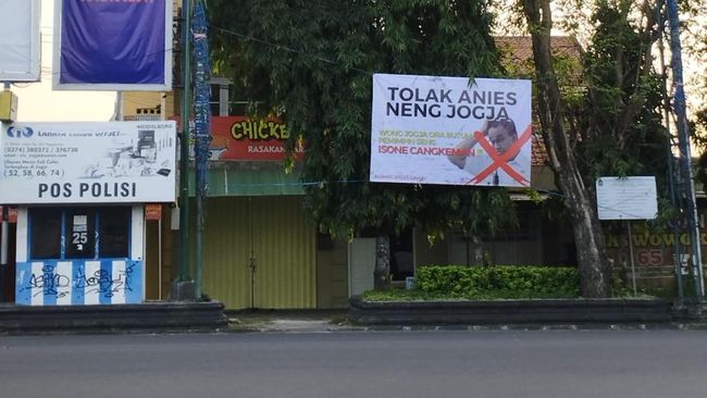 Spanduk penolakan kedatangan calon presiden (capres) Anies Baswedan ke Jogja sempat terpasang di wilayah Jogja. Spanduk tersebut tepatnya terpasang di Simpang tiga Jalan Kolonel Sugiono, Umbulharjo, Kota Jogja.