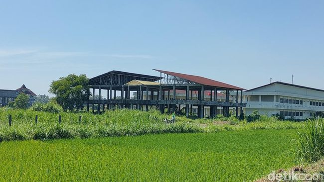 Pantauan detikJateng di lokasi, bangunan SMPN 1 Wates itu berada di area sawah Beji, Kapanewon Wates, Rabu (24/5/2023). Terlihat bangunan dua lantai yang bersebelahan dengan Gedung Field Research Center (FRC) UGM dan SDN Wates terpadu itu terbengkalai.