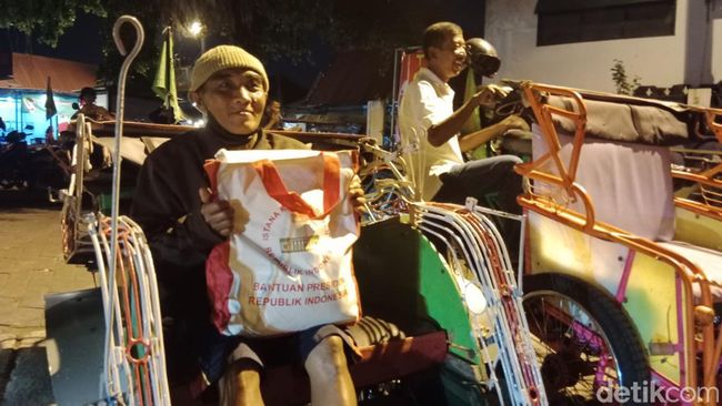 "Ini tadi pak becak disuruh baris berjajar, terus dibagi sembako sama bapak-bapak petugas, pengamanan," ujar salah satu tukang becak, Rukun (59) kepada wartawan.